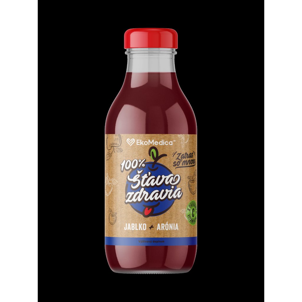Zloženie: Jablková šťava (70%), šťava z koncentrovanej šťavy z ovocia Arónie (30% ),prírodný vitamín C, pasterizované
